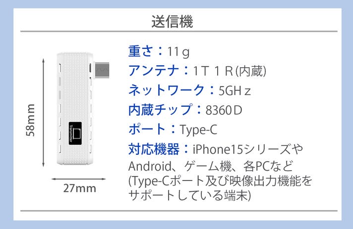 側面に送信部があるので、スマホを手に持ったままでも動きを制限されることなく映像が転送できます。