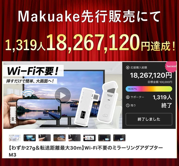 「Makuake(マクアケ)」は、実行者の想いを応援購入によって実現するアタラシイものやサービスのプラットフォームです。このページは、 プロダクトカテゴリの 「【アンコール】転送距離最大30m&Wi-Fi不要のミラーリングアダプターM3」プロジェクト詳細ページです。