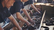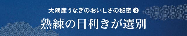熟練したうなぎの目利きが迅速に選別。超特大うなぎに育つのは、飼育されている約30,000尾のうなぎの中からわずか0.45%のみ。厳しい基準を満たしたうなぎを選別しています。