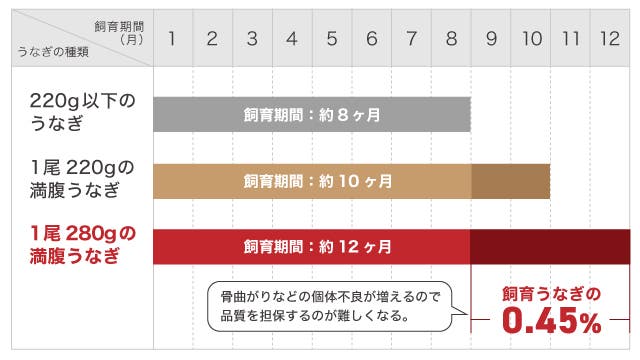 この1年は、普段のうなぎの成長より20%ほど生育が遅く、飼育に苦労した年でした。満腹うなぎは、蒲焼き1尾220g以上にこだわっているので、その基準を満たしつつ骨曲がりなどの品質を担保しながらの生育はとても苦労しました。