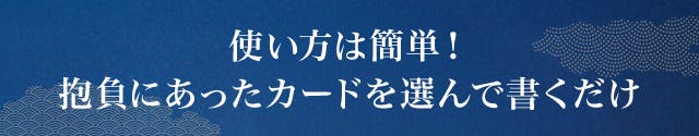 使い方は簡単です。それぞれに想いを込めたデザインのカードを5種類ご用意しているので、カードに抱負を書いていただくだけ。お一人でこっそり書いても良し、ご家族やご友人とご一緒に書いていただいてもOK。ご自由にお使いください。片方の目は願いが叶ったときに入れましょう!