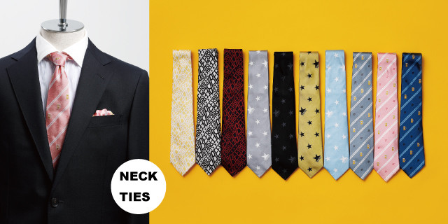 ネクタイは3デザインの10カラー展開です。パッと目を惹く色柄から、使いやすい落ち着いた色柄まで幅広いカラー展開があります。