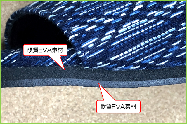 アウトソールを、硬質のEVA素材だけではなく、軟質のEVA素材と二層構造にして、足から床に伝わる衝撃を吸収しやすくする事により、ペタペタ音を軽減しました。