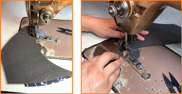 バンドの裏生地と表生地を合わせてミシンでつなぎます!