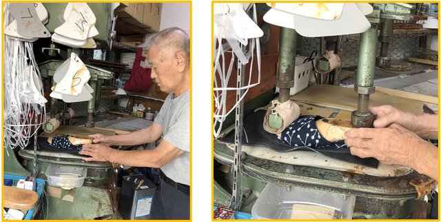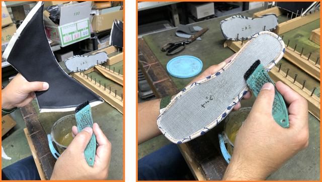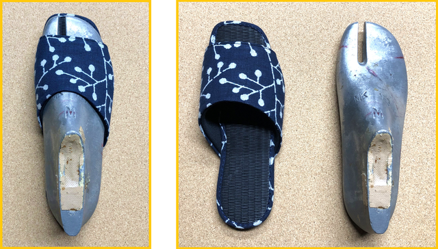 それを軽減するため、スリッパの左右を作り、足入れには、ラストを使って一足一足バンドをつり込み仕上げました。