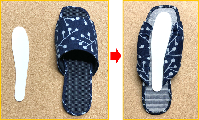 そうならない用に、サンダルでは、よく使用します2mmの紙芯ボール+2mmのスポンジに、黒畳を貼り付け中敷きを作りました。