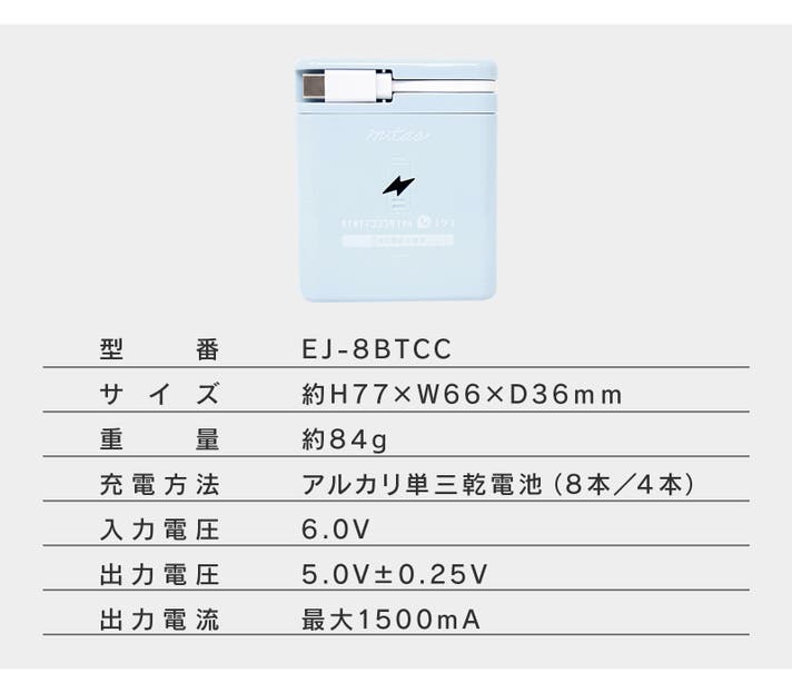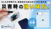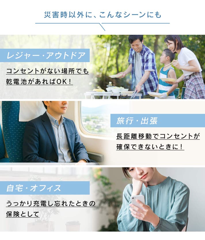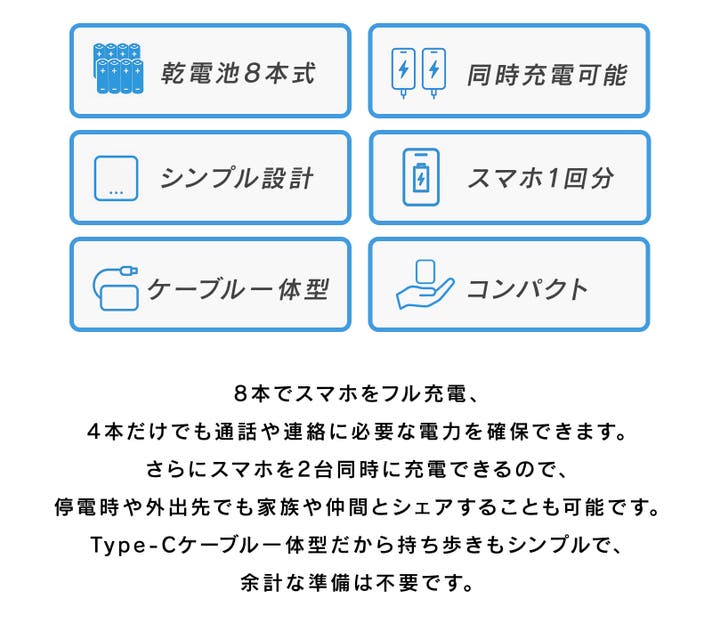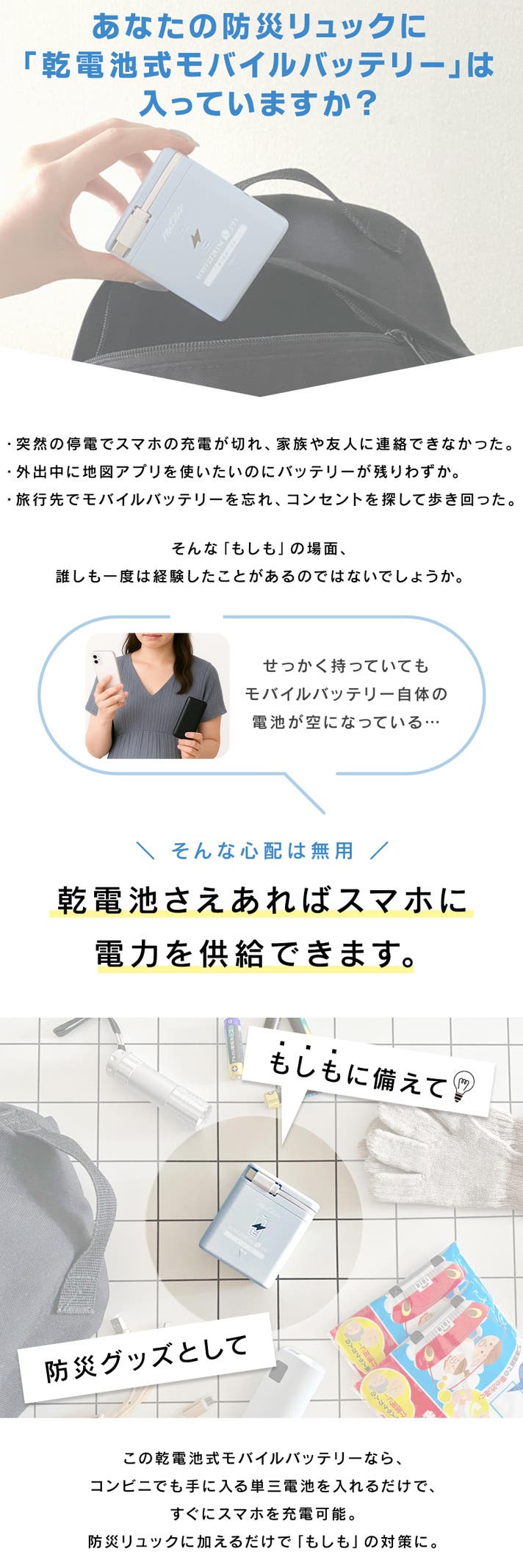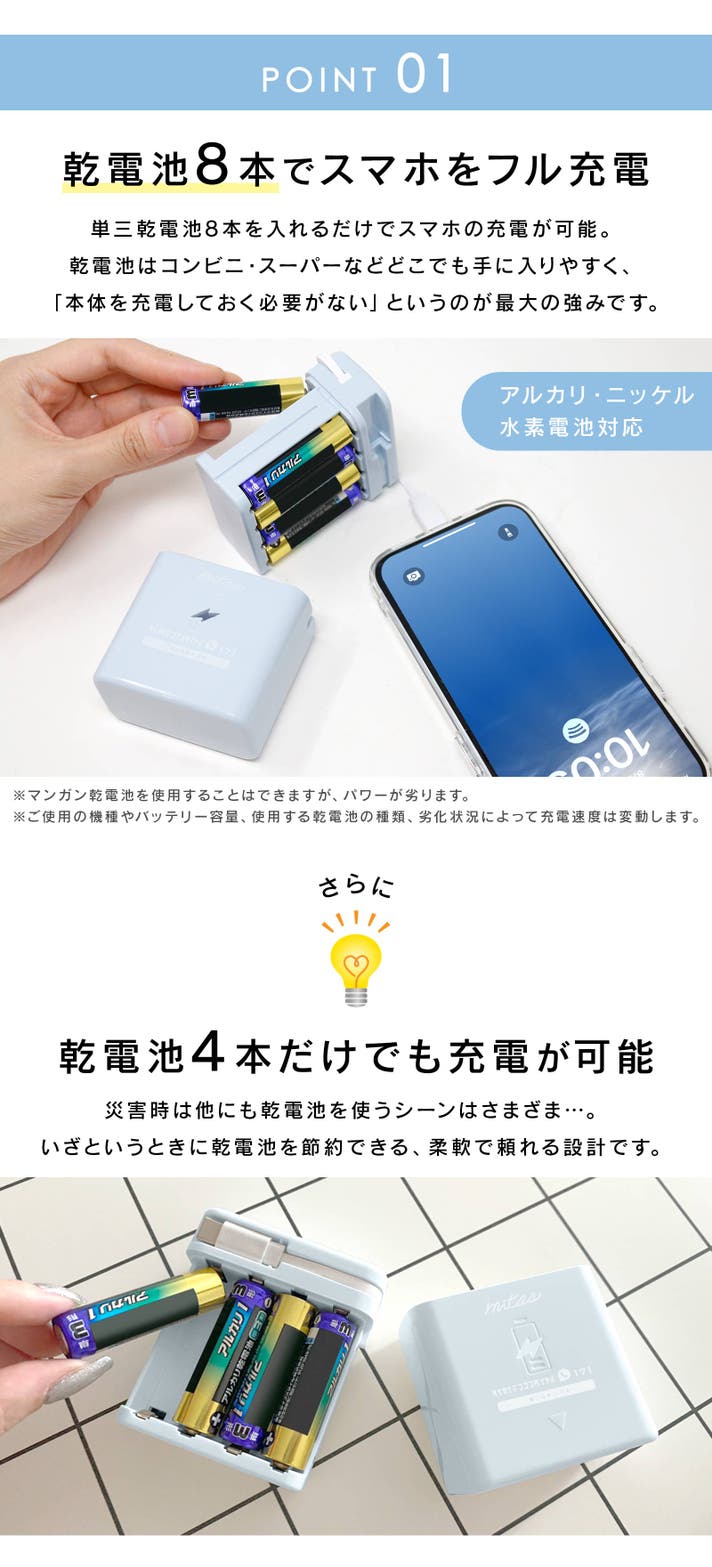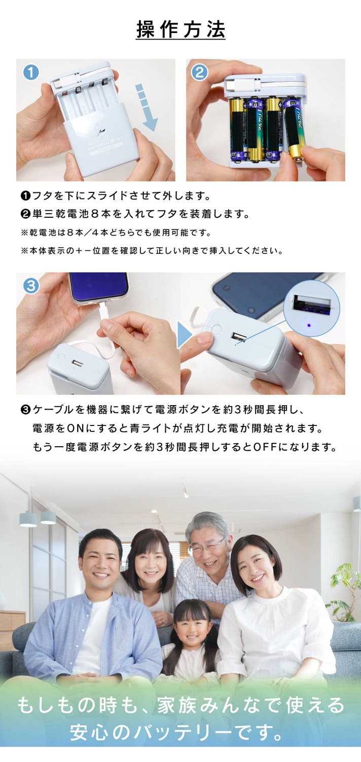 - 【乾電池8本でスマホに電力供給】コンビニでも手に入る乾電池で、緊急時でもすぐ使える