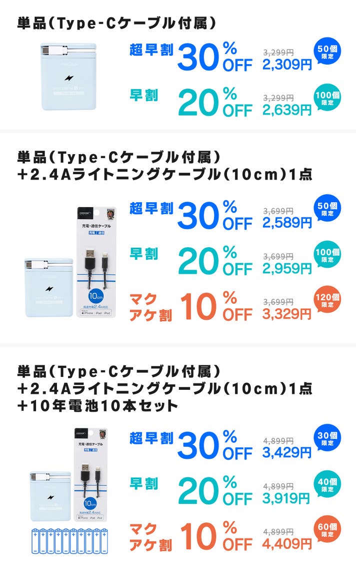 【早割20%OFF】本体(Type-Cケーブル付属)1点+ライトニングケーブル1点+10年電池10本セット
