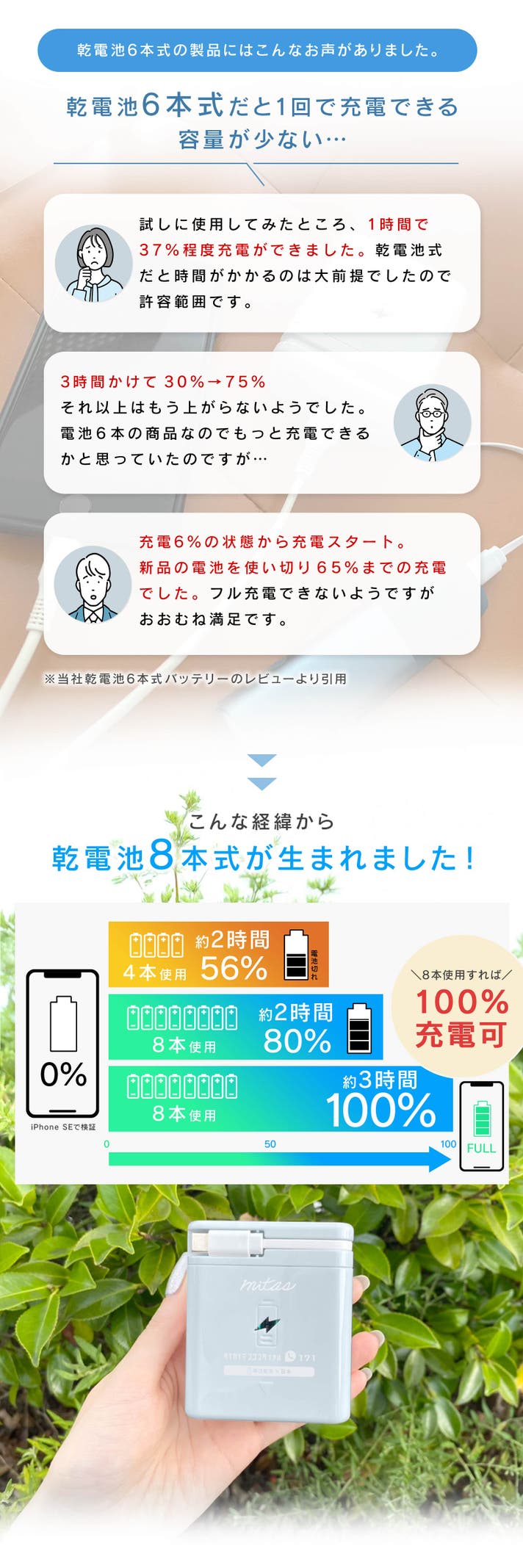 私たちは、災害時やアウトドアでも“乾電池さえあれば”スマホを守れる「乾電池式モバイルバッテリー」を作りました。8本使用でiPhoneを1回フル充電。4本でも通話や連絡には十分な電力を確保できます。