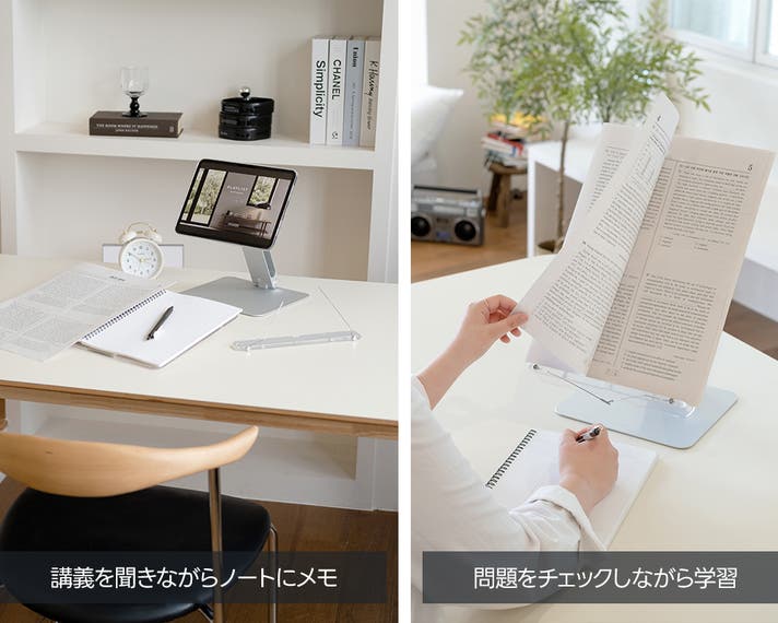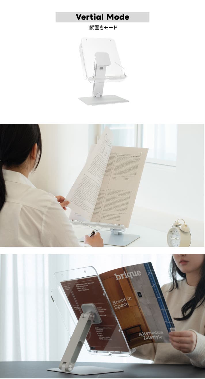 読書はもちろん、専門書や雑誌などにも最適なブックスタンドとして活用できます。長時間開いたままでも安定して固定でき、快適な読書環境を実現します。