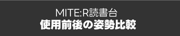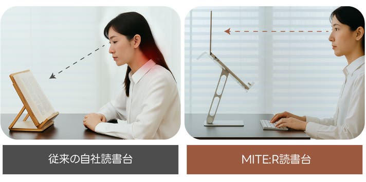 従来の自社読書台を使用すると視線が下向きになり首に負担がかかりますが、MITER読書台を使用した場合は視線がほぼ一直線になり、姿勢が自然に正しく整う様子。