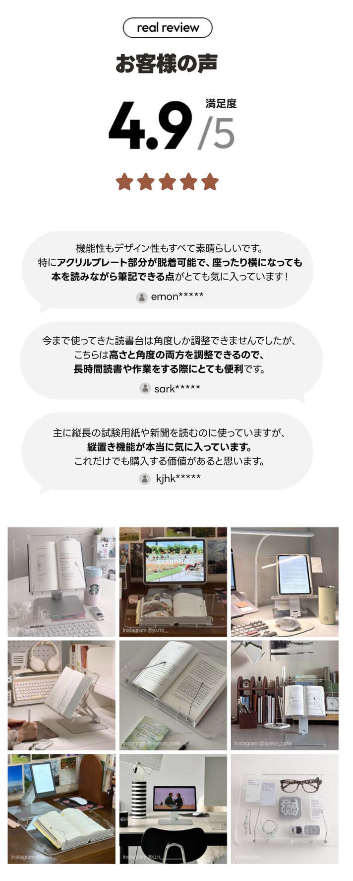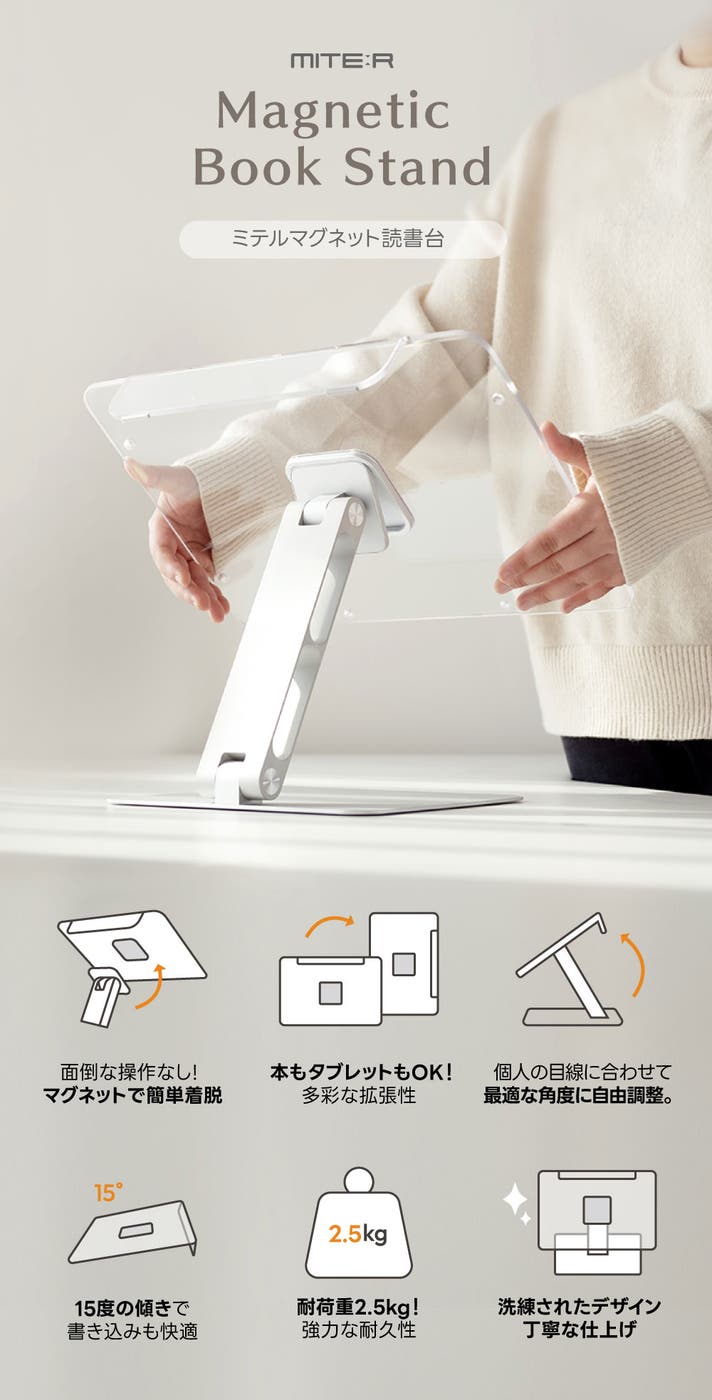 この商品を輸入しようと思った理由:本とタブレットが好きで読書台をいくつも使ってきましたが、MITE:Rは高さも角度も自由に調整でき、アクリルプレートを外せば持ち運びにも便利です。