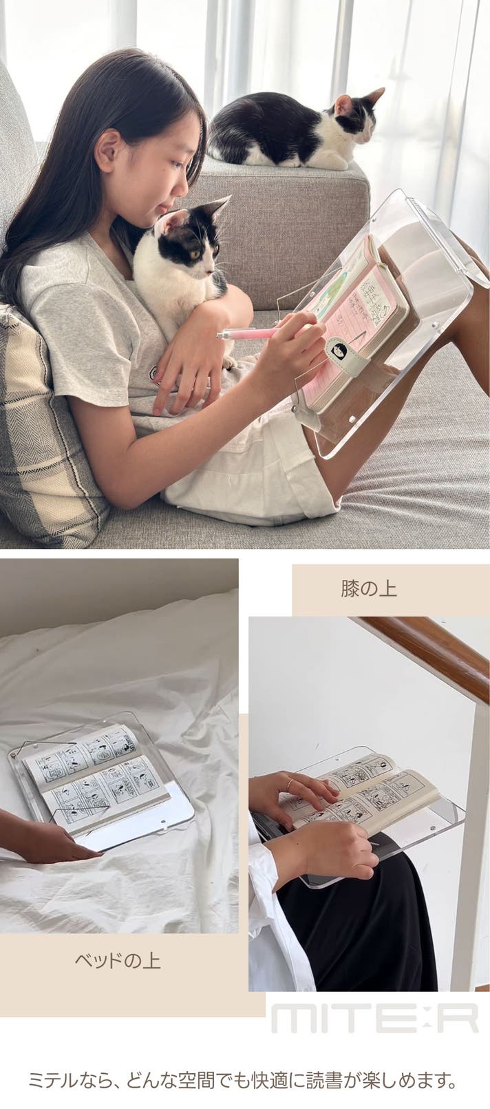 「MITER」は机やテーブルでしか使えない、そんな固定観念はもう不要です。ベッドの上や膝の上に置いて読書をしたり、日記を書いたりしたいときは、アクリルプレートを活用してみてください。