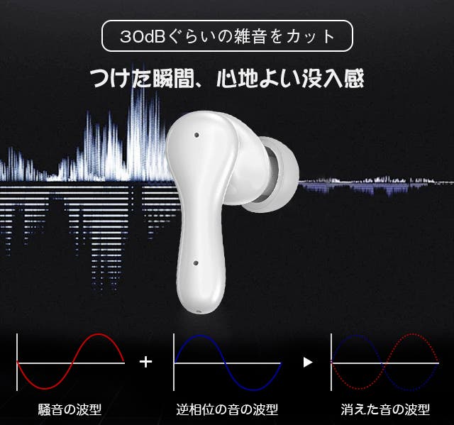ノイズキャンセリング機能は、騒音の音波と逆位相の音波をぶつけて打ち消す機能です。街の喧噪や機内や電車など交通機関による騒音などの環境音を大幅に除去します。30dBぐらいの雑音をカットし、騒がしい環境でも自分だけの音楽空間をお楽しみください。