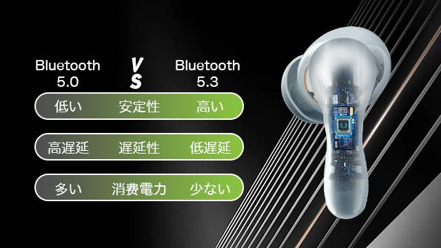 Bluetooth 5.3搭載で、より速く・より安定した転送かつ低消費電力を実現できます。従来の音飛び、途切れ、通信問題、遅延の状況などを幅広く改善されました。