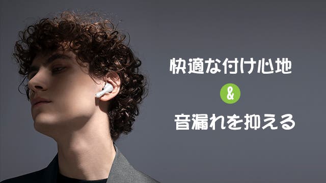 イヤーピースは高品質のシリカゲルを採用し、耳の形に自然に優しくフィットします。隙間なくフィットすることで音漏れが抑制効果も期待できます。自宅はもちろん、カフェなどのパブリックスペースでオンライン会議をしていても、音漏れを気にする必要はありません。快適な装着感で、長時間装着しても不快感や痛みなどを感じられません。
