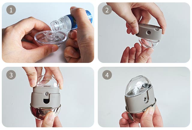 タンクに純水などを入れ、本体に取り付け、ボタンを押すだけの使いやすい構造です。