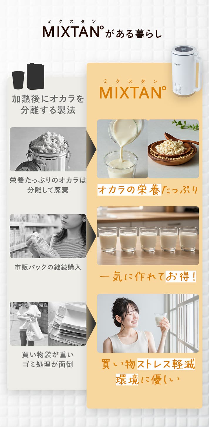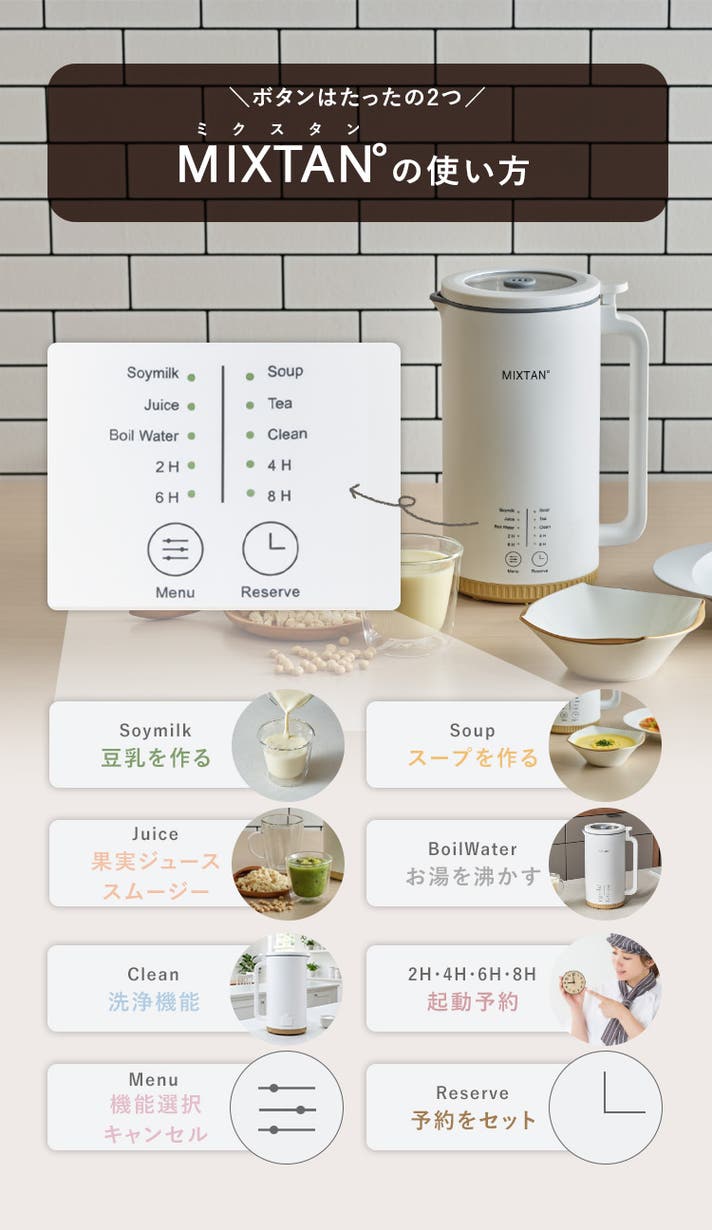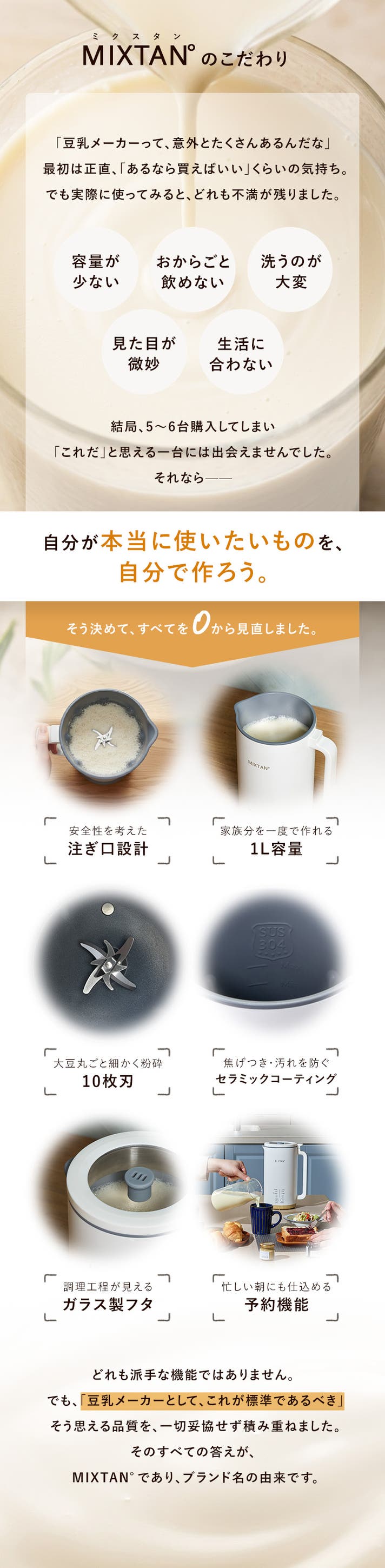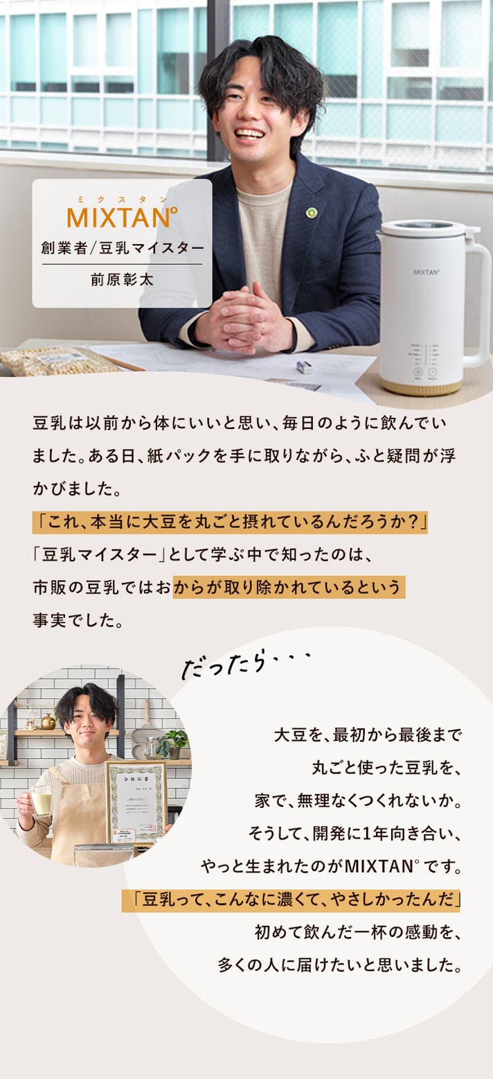 「Makuake(マクアケ)」は、実行者の想いを応援購入によって実現するアタラシイものやサービスのプラットフォームです。このページは、 プロダクトカテゴリの 「「買うより、つくる。豆乳習慣」自宅で簡単・30分!豆乳メーカー【MIXTAN°】」プロジェクト詳細ページです。