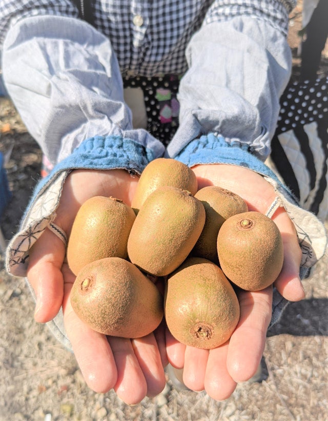 集中豪雨や猛暑に振り回されながら毎日キウイのお世話をして秋が来ると10日ずつくらいで抜き打ち糖度検査をします。順調に糖度が上がってきたら日照時間など参考にして収穫日を決めます。10月中旬から下旬ごろにようやく収穫になるのです!
