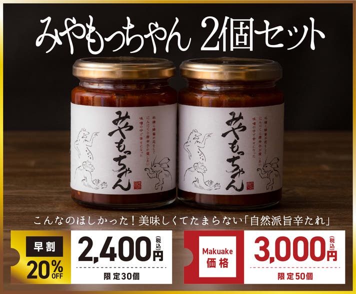「Makuake(マクアケ)」は、実行者の想いを応援購入によって実現するアタラシイものやサービスのプラットフォームです。このページは、 フードカテゴリの 「誰もが求めていた旨辛ソース「みやもっちゃん」新登場!」プロジェクト詳細ページです。