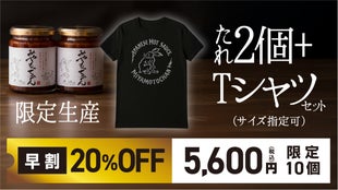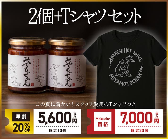 【セット内容: ●みやもっちゃん (旨辛たれ) 250g x 2個 ●Tシャツ 1枚 (※応援購入後、ご希望のサイズをご指定ください)】 みやもっちゃんファンの欲張りなあなたへ。旨辛Tシャツ、できました。