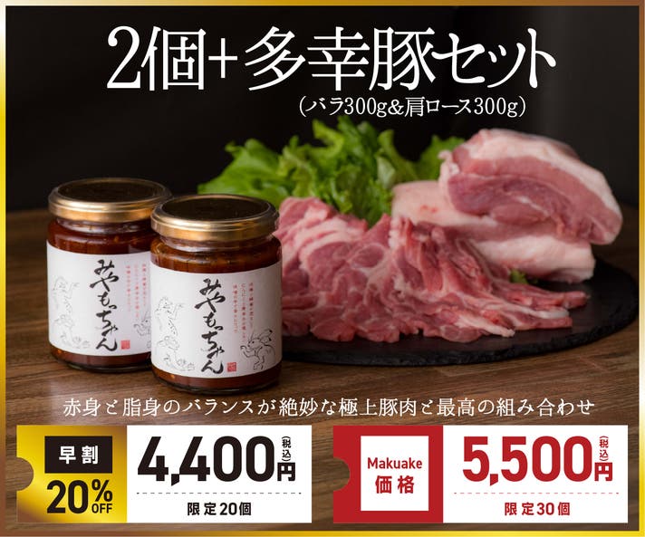 【セット内容: ●みやもっちゃん (旨辛たれ) 250g x 2個 ●多幸豚バラ300g・多幸豚肩ロース300g】赤身と脂身のバランスが絶妙なブランド豚「多幸豚(TA KO BUTA)」と、 旨辛でコク深い「みやもっちゃん」がコラボした特別セットです。