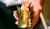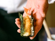 TOP画像でもご紹介の、手渡しでいただく「お鮨」、ではなく「車海老海苔巻き」。コースの途中で「天丼が食べたい」欲望に応えるここでしか食べられない逸品です。〆の定番「トマトリゾット風 天ばら」はトマトの酸味と天ぷらの相性が抜群で女性に大人気。