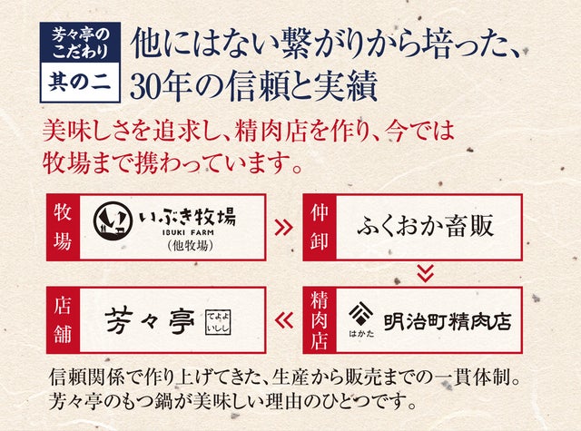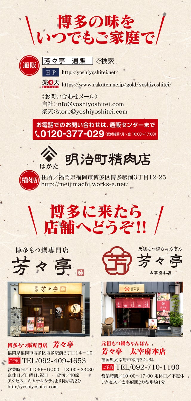 全国の百貨店バイヤーが10年以上選び続ける、博多を代表する博多芳々亭(ハカタヨシヨシテイ)自慢の博多もつ鍋と、日本一3連覇の宮崎牛を使い、ファベックス金賞等の実績を持つ、はかた明治町精肉店のコラボ企画となります。