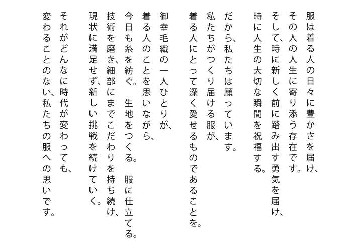 また、国内の小樽と長崎にオーダースーツ専用の縫製工場を所有し、オーダースーツブランド「ミユキクラフツスーツ」を展開するなど、ウール素材・毛織物やドレス仕立ての高級服に関して、確かな実績を積み重ねてきた“ウールのプロフェッショナル集団”です。