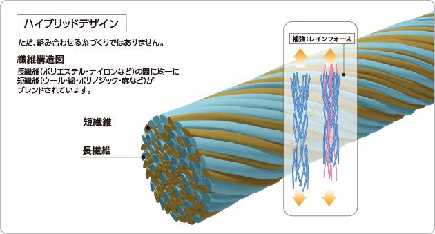 短繊維と長繊維が均一に混繊されることにより、毛羽立ちと糸切れを抑えることが可能となり、美しく強い糸構造となっています。