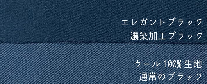 上が濃染加工したエレガントブラック、下が通常に染色されたスーツ生地で明らかに濃度が違います。