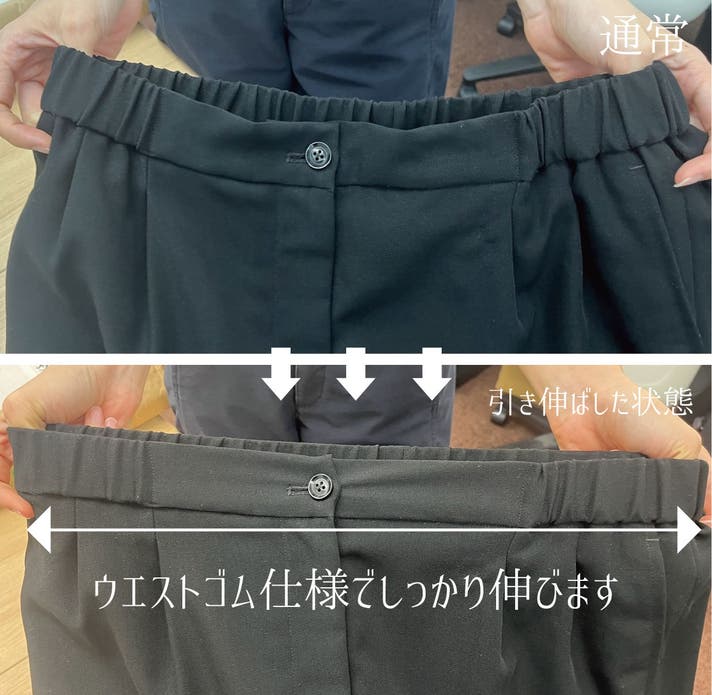 体型変化に対応するため、ウエストゴム仕様でしっかりカバーしています。