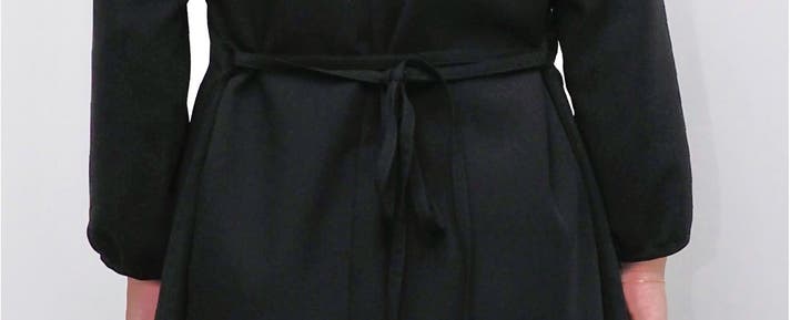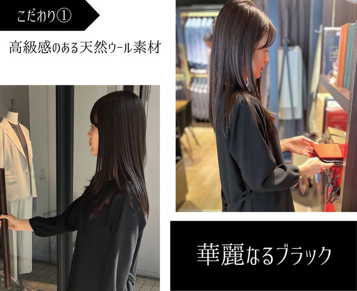 またリボンを絞って身体のラインを見せてもキレイですし、リボンを緩めてもウール素材の独特のドレープ性(落ち感)が、とてもエレガントで高級感があるので、どちらの着方でも楽しめます。
