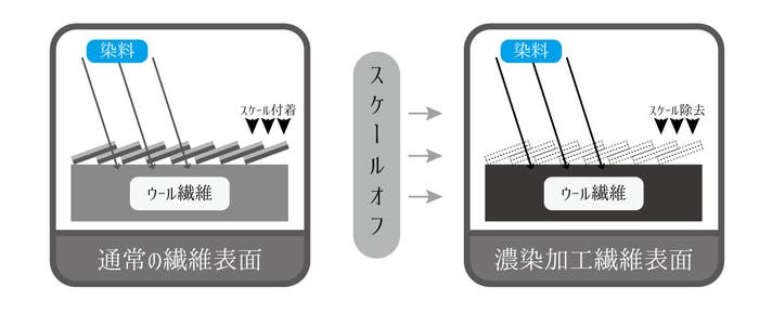 ウールには毛の表面を覆うスケールと呼ばれるうろこ状の表皮があり、このスケールには水を弾く性質があるため染色の事前にこのスケールを取り除く必要があります。このスケールを取り除く工程を「スケールオフ」と呼び、スケールオフされたウール原料を染色すると、染料が糸内部まで沢山浸透するため、通常のモノより深い色で染めることが可能です。