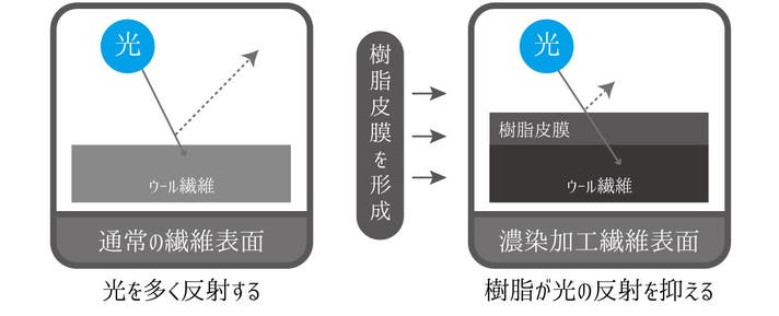 スケールオフをして濃度が上がっても、通常の生地は光の反射率を受けて色が浅く見えてしまいます。そこで生地の表面に光の屈折率の低い樹脂皮膜を形成し、生地に光の透過率を上げて深くて濃い美しいブラックを表現しました。