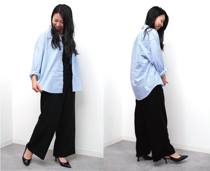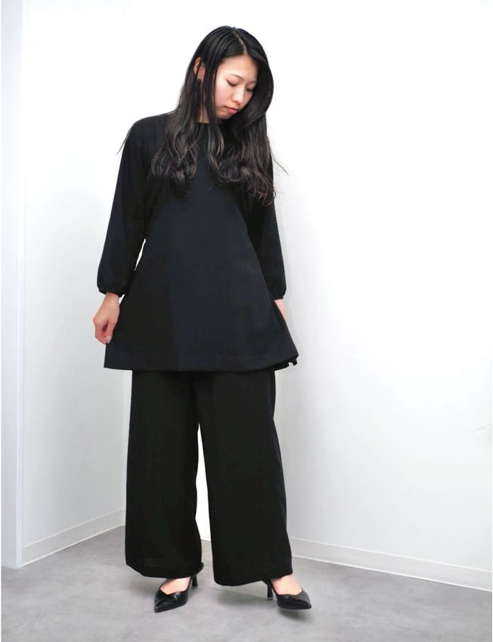 トップスはお腹とヒップまで隠れる丈のチュニックとウエストゴム仕様でゆったりしたシルエットのワイドパンツの組み合わせになります。