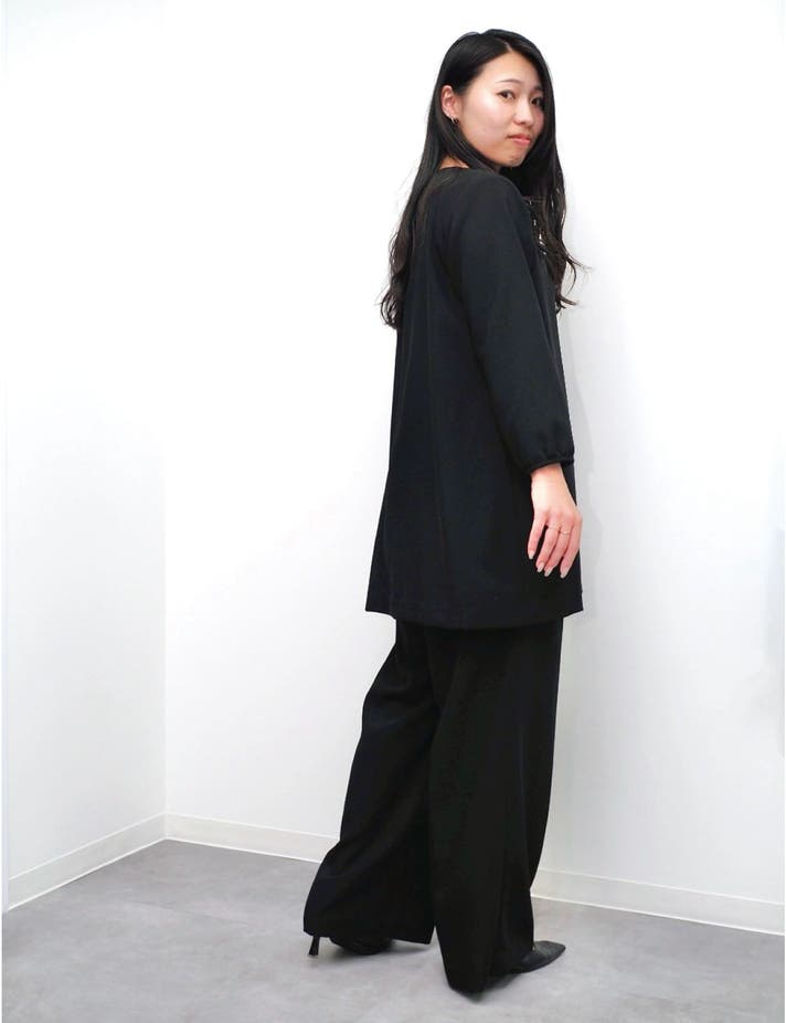 天然ウールを原料とした「ウールマナード糸」を用い、自社で開発した生地で仕立てたブラックフォーマルのセットアップです。