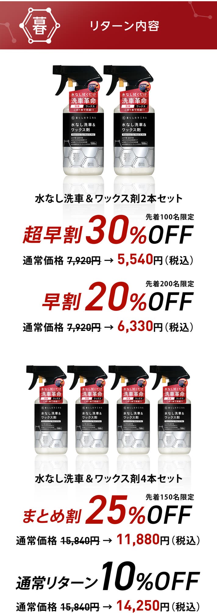 【水なし洗車&ワックス剤 2本セット】早割 20%OFF(先着200名限定)