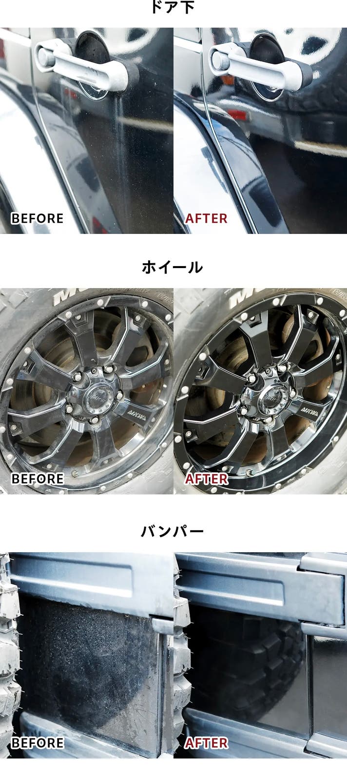 ドア下やホイールなどの細かい部分まで、驚くほどスッキリ。