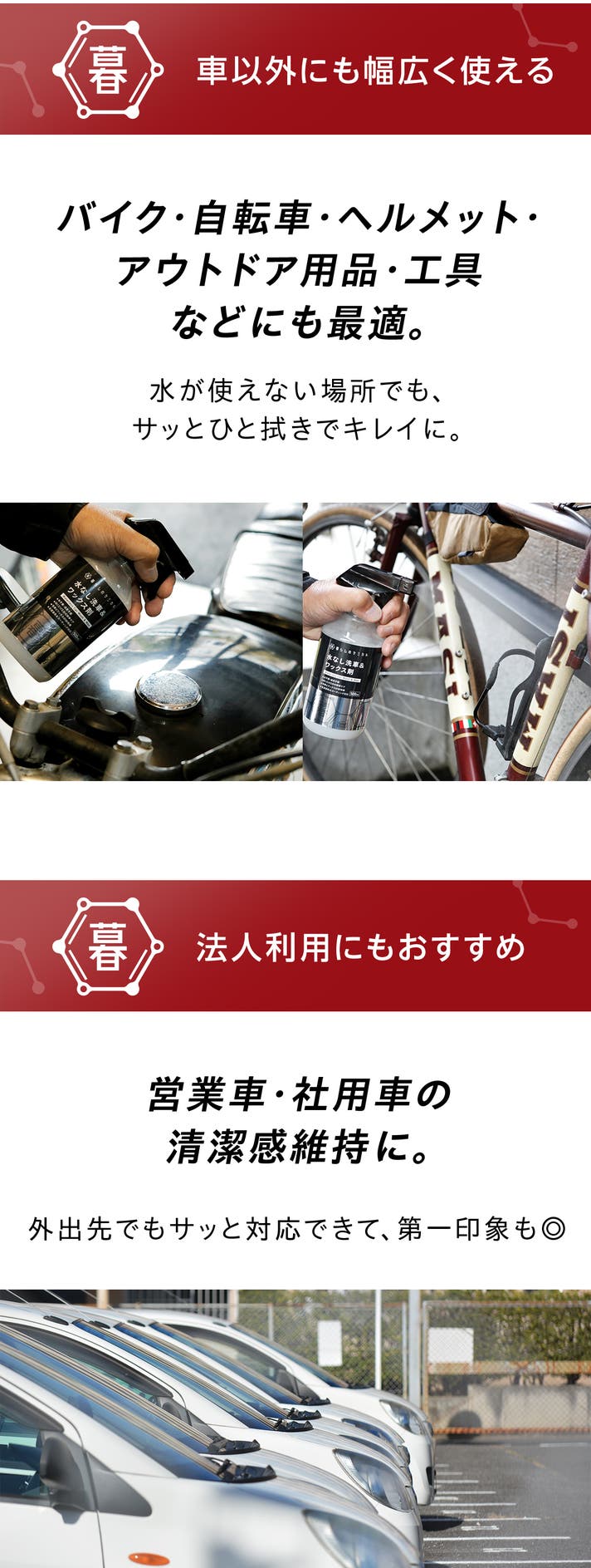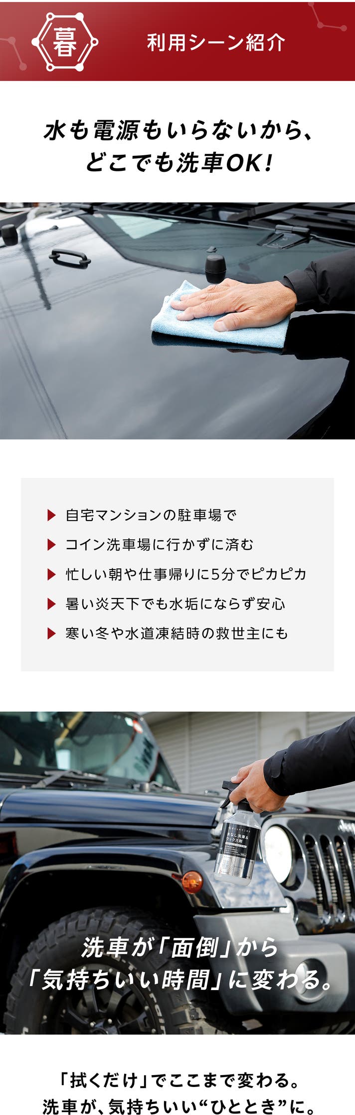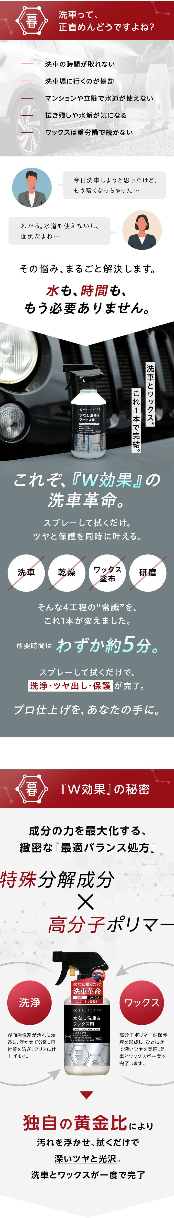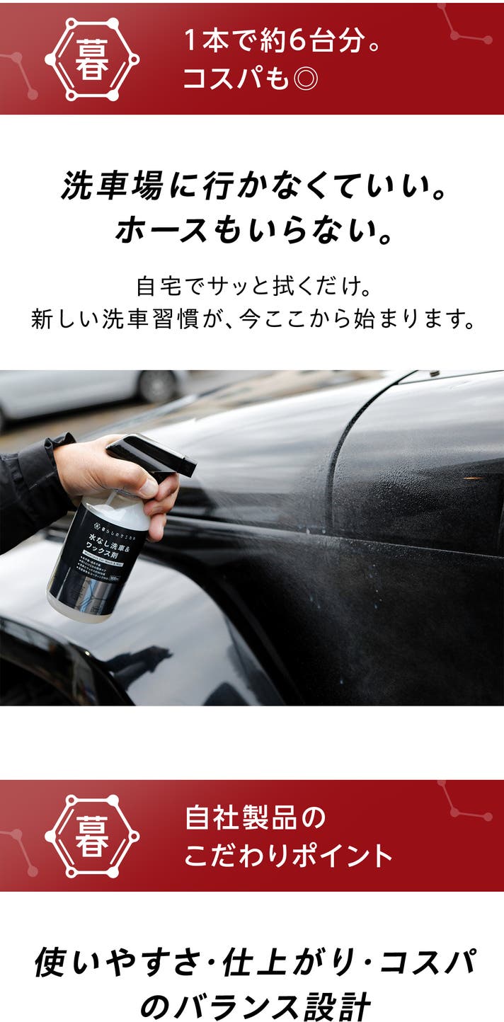 水もホースもいらない、新しい洗車のかたちがここにあります。手間をかけず、ツヤと清潔感を気持ちよくキープできる毎日へ。