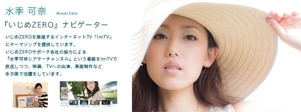 「いじめZEROプロジェクトのナビゲーター」歌手、女優、モデルの活動を通して いじめ撲滅を目指しています、映画「十字架」 映画「早乙女4姉妹」に出演。
