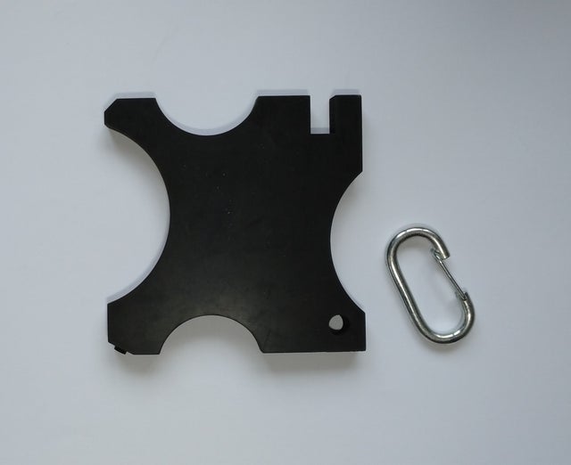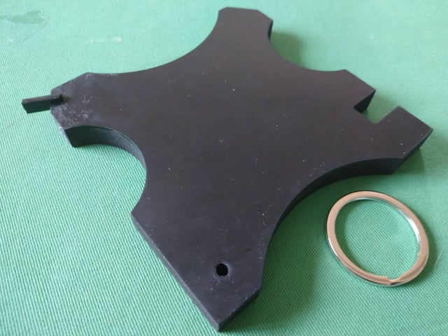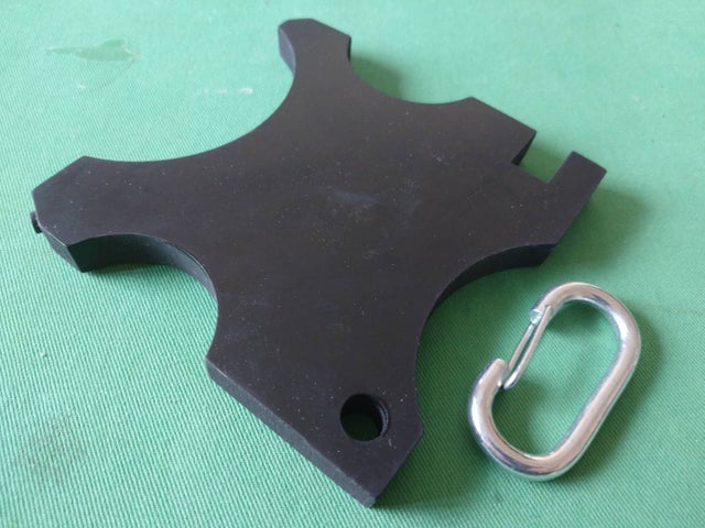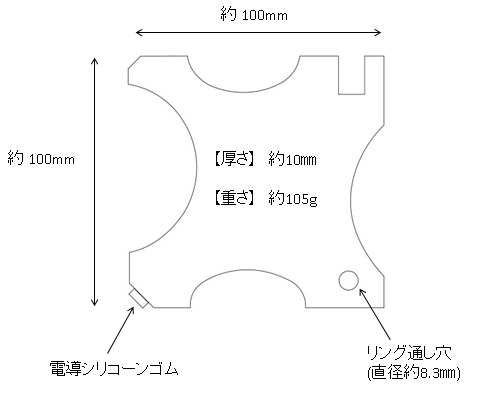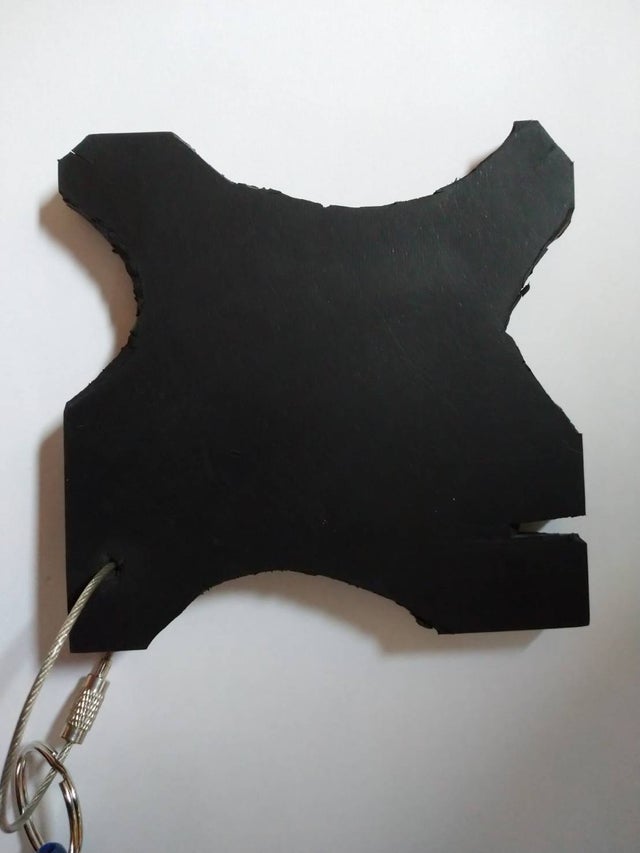 これらを解決するために、 ゴム製品に詳しい方からアドバイスを頂き、素材には臭いの少なく硬度が高めのクロロプレンゴム、厚さは10㎜を選びました。 さらに、サムターン等を挟める凹部分と、キーリング等を通すための穴を追加しました。