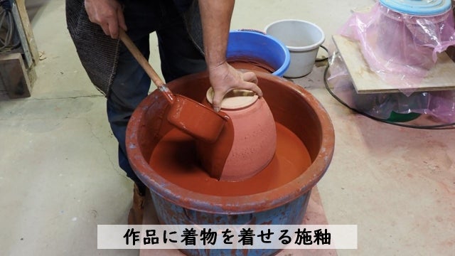 その後、十分寝かせてから入念に仕上げを行い、乾燥、素焼きをして施釉に入ります。釉薬は8年以上熟成させたものを使い良い発色を促します。