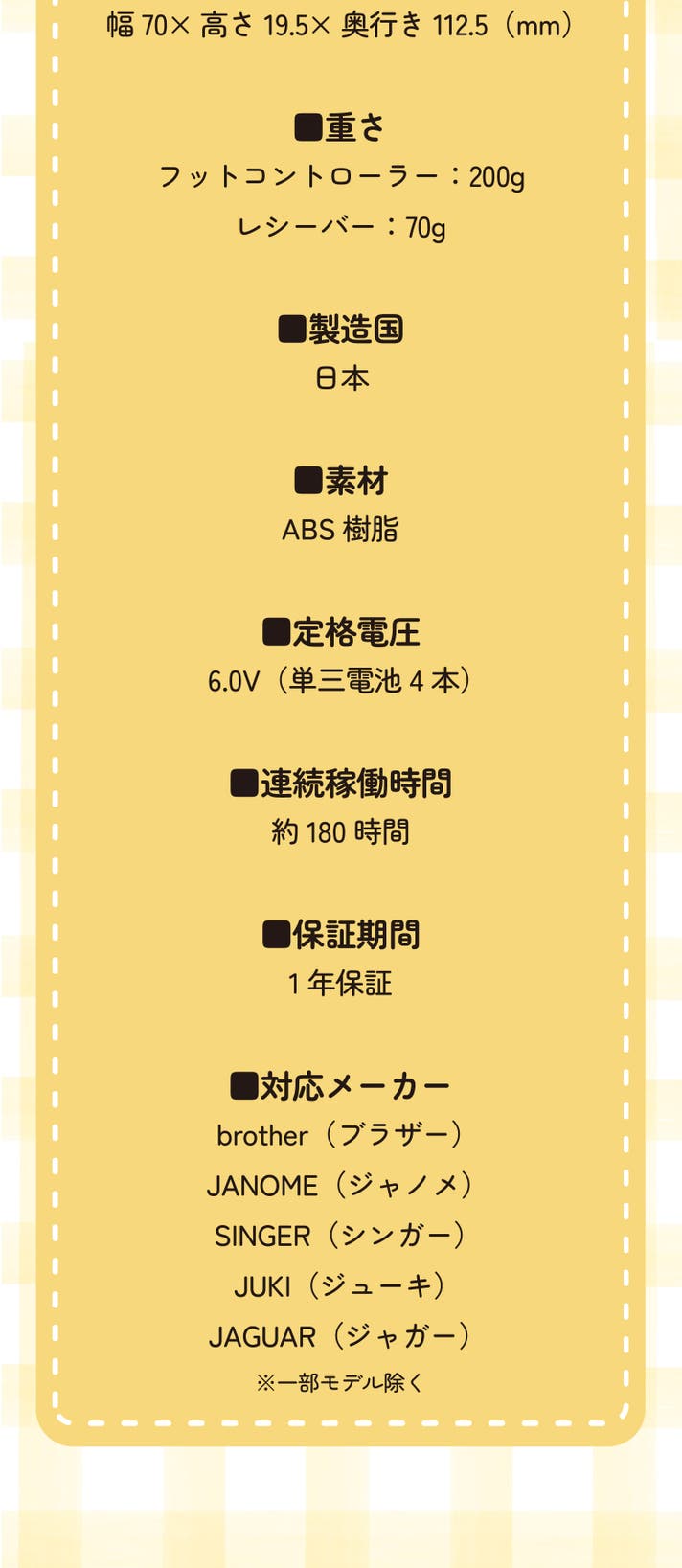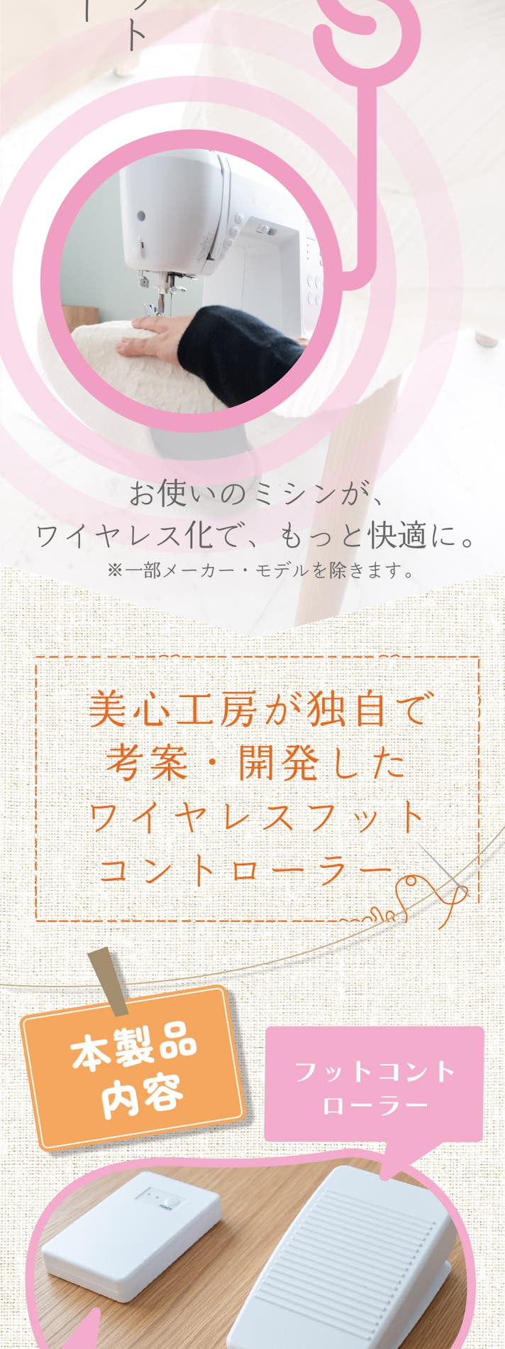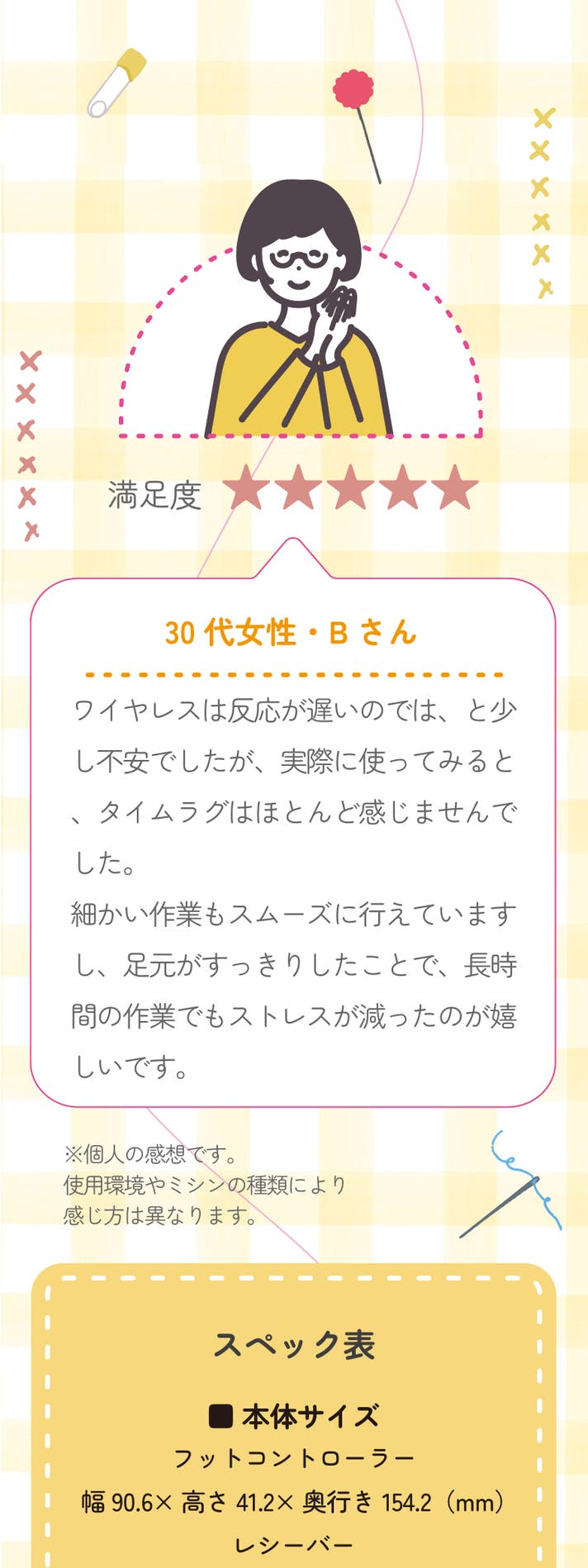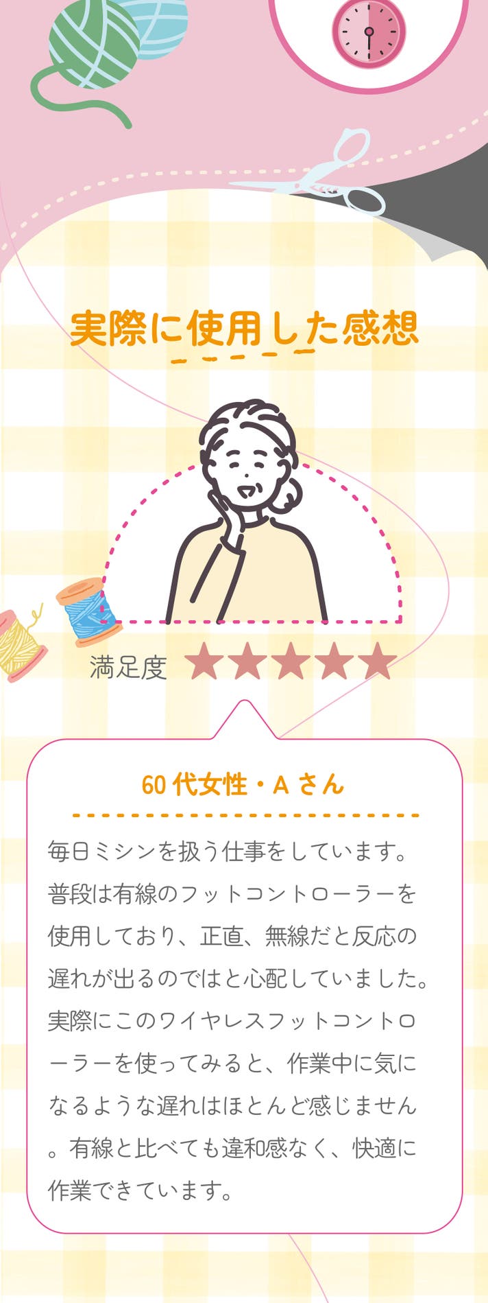 本製品はミシン操作に適した無線方式を採用しています。感じ方には個人差がありますが、通常の縫製作業において大きな遅れを感じにくい設計を目指しています。※感じ方は使用環境やミシンの種類により異なります。