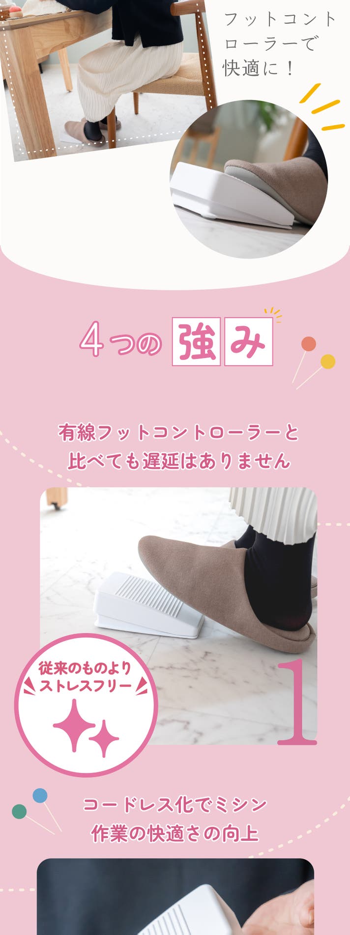 - コードレス化で、足元のストレスから解放され、ミシン作業がより心地よくなります。