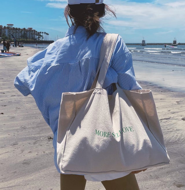 "MORE SELF-LOVE"のプリント入りBIG BAGと、セルフラブジャーナルとお礼メッセージ入りポストカードのセットです。無漂白で環境に配慮した素材。