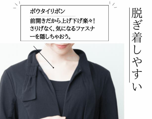 年齢が出やすい首まわりのシワや肉感は、【ボウタイリボンネック】でおしゃれに隠し、ほっそり魅せ。