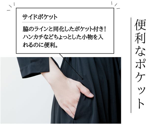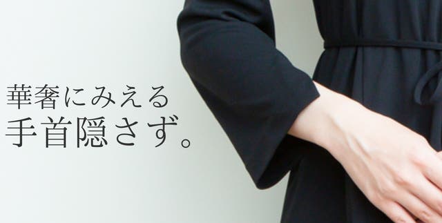 腕の一番細い部分の手首は、七分袖と【袖口エレガントスリット】で強調し、スリムな印象に。手首を見せるのは、シルエット全体が細見えする力となるのです!