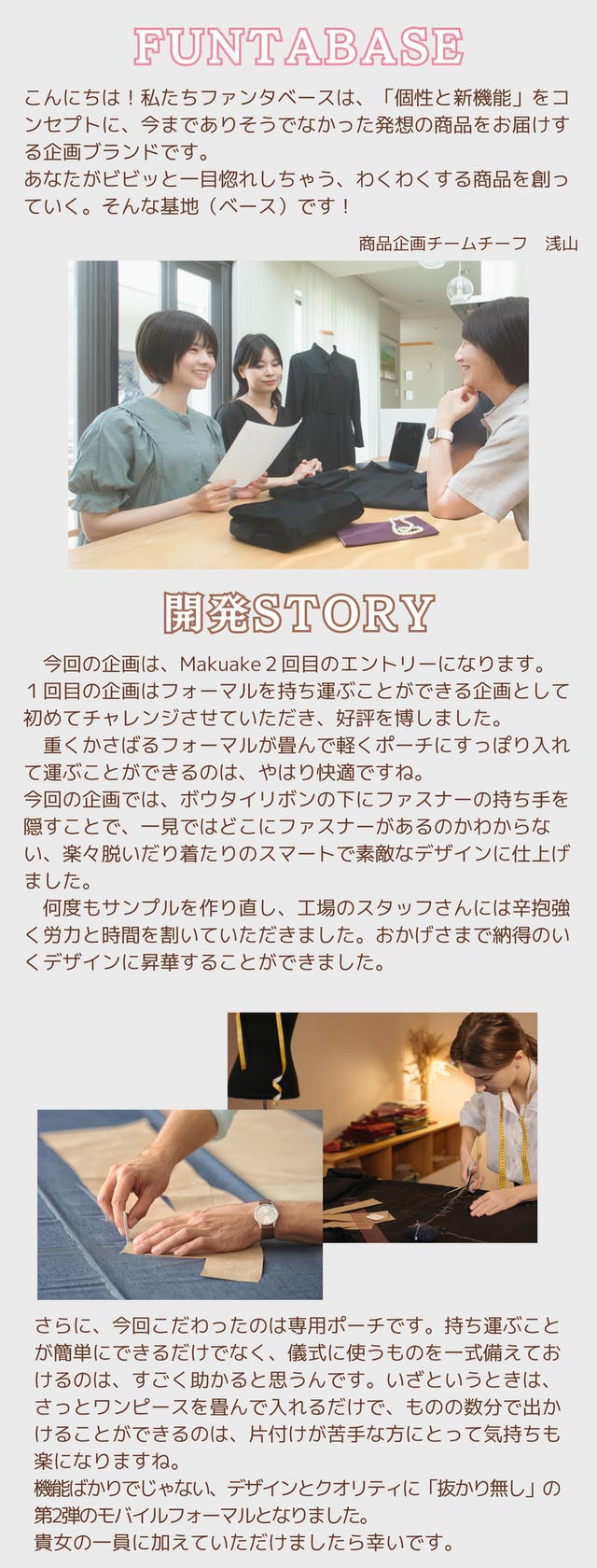 わたしたちは、「モバイルフォーマル」を企画するにあたり、現在工場とデザイン・仕様を実現できるよう、プロジェクトを誠心誠意進めています。 しかしながら、開発中の工程において、デザイン・仕様が一部変更になる可能性もあります。 デザイン・仕様の変更は、より良い商品を皆様のお手元に届けたいからであること、ご理解頂けると幸いです。使用感などに関しては、感じ方に個人差が予想される製品でございます。そのため、使用感等に関する返品・返金はお受けいたしかねます。 製造スケジュールについては、現在プロジェクト成功を想定した数で調整しておりますが、 ご応援購入数が想定を上回った場合、製造工程上の都合や配送作業に伴う止むを得ない事情により、 お届けが遅れる場合がございます。 ※一部国内に類似品が出回っている場合がございます。他社の類似品に関してのお問い合わせには対応できかねますのでご了承ください。 ※皆様の応援購入により量産効率が向上した場合、正規販売価格が販売予定価格より下がる可能性もございます。 ※スケジュールは、あくまでプロジェクト公開時点の予定です。応援購入の性質上、配送遅延のおそれがございます。 ※原則として、配送遅延に伴う応援購入のキャンセルはできませんが、リターン配送予定月から3ヵ月を超えた場合には、希望者に限りキャンセルにて対応させていただきます。 いずれの場合においても、できる限り速やかに活動レポートなどで皆様と共有を行っていく予定です。 最後に、「モバイルフォーマル」を手に取っていただいた皆様に喜んで頂けるよう、チームメンバー一同心を込めて対応していきますので、何卒よろしくお願い致します。