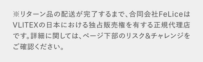 プロジェクトに関する情報 ・プロジェクトの属性:輸入商品 ・代理店によるサポート:初期不良のみ交換対応(お届けから14日以内) ・プロジェクト実行者(国):日本 ・製品者(国):ドイツ ・製造者(国):中国 ※並行輸入品が発生する可能性があります。正規以外での個人輸入等は、完全に防ぐことができない場合がございます旨、予めご了承のほどお願いいたします。 ※リターン品の配送が完了するまで、合同会社FeLiceはVLITEXの日本における独占販売権を有する正規代理店です。並行輸入品が発生する可能性がございますが、並行輸入品には正規代理店による製品サポートを受けることができません。 また、正規代理店を通じて購入することで、日本国内での流通に必要な各種認証の取得や、関税の適切な処理が担保されます。 ※一部国内に類似商品が出回っている場合がございます。弊社では他社の類似品に関してのお問い合わせには対応できませんのでご了承ください。 ※使用感などに関しては、感じ方に個人差が予想される製品でございます。そのため、使用感等に関する返品・返金はお受けいたしかねます。 ※初期不良以外に関する返品・返金はお受けいたしかねます。 ※デザイン・カラー・素材などの仕様が一部変更になる可能性がございます。 ※モニター環境によって、画像の色が実物と異なって見える場合がございます。 ※応援購入の数が想定を上回った場合、製造工程上の都合等により出荷時期が遅れる場合がございます。 ※皆様から想定を上回る応援購入を頂き、量産体制を更に充実させることができた場合、一般販売価格が予定価格を下回る可能性がございます。 ※本プロジェクトはアンコールプロジェクト(*)の実施可能性があります。 (*)アンコールプロジェクトとは、実施したプロジェクトが好評だった場合において、当該プロジェクトが終了後に再び数週間から数ヶ月程度実施するプロジェクトを言います。 アンコールプロジェクト実施の場合、本プロジェクトとアンコールプロジェクトで同じ配送月を設定する可能性もございますが、本プロジェクトのサポーターを優先して配送いたします。 ※本文中に記載させていただいたスケジュールは、あくまでプロジェクト公開時点の予定です。応援購入の性質上、配送遅延のおそれがございます。原則として、配送遅延に伴う応援購入のキャンセルはできませんが、リターン配送予定月から3ヵ月を超えた場合には、希望者に限りキャンセルにて対応させていただきます。 【商品等の不具合による返品・交換】 原則として、サポーター都合によるキャンセル・返金は承っておりません。 (サポーター都合のキャンセル不可の例:サイズが合わない、誤注文、長期不在) ◾️対応条件: 商品の初期不良、またはお届けした商品がご注文内容と異なる場合、到着後14日以内にプロジェクトページの「実行者にメッセージ」よりご連絡ください。状況を確認の上、返金対応、または良品との交換対応をさせていただきます。 ◾️返金額: リターン金額(税込)の全額 ◾️返品送料/再送料: 実行者負担 【返品・交換をお受けできない商品】 ・サポーターの責任により破損、汚損が生じた商品 ・商品のタグ、付属品、パッケージ(箱、袋など)を紛失、破棄された商品 ・事前にご連絡をいただいていない商品 ・商品到着後、15日以上経過した商品 【交換をお受けできないケース】 ・限定品や同一商品の在庫がない場合など、代替品をご用意できない商品 以上の注意点につきましてあらかじめご理解とご了承いただいた上で応援購入くださいますよう、よろしくお願い申し上げます。 最後に、本製品を手に取った皆様に喜んでもらえるよう、チームメンバー一同心を込めて対応していきますので、 応援よろしくお願い致します。